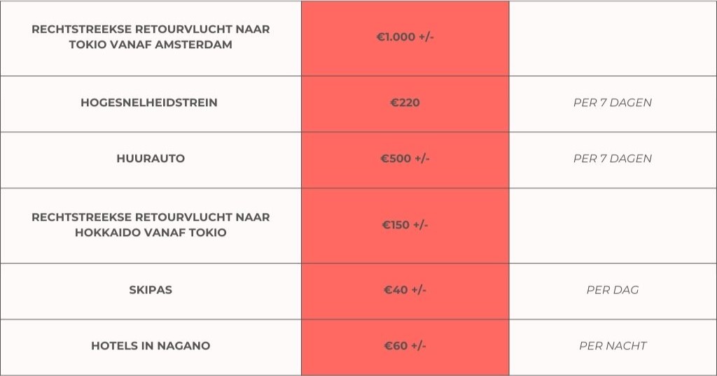 Het klinkt allemaal erg mooi, maar wat gaat het kosten om te skiën in Japan? Allereerst zul je er natuurlijk moeten komen. In de door ons aangeraden periode betaal je voor een rechtstreeks retourtje vanaf Amsterdam naar Tokio, met KLM, minder dan €1.000 per ticket. Zorg wel dat je op tijd boekt. Vanaf de hoofdstad kun je met de hogesnelheidstrein naar de Japanse Alpen, een weekpas kost €220.